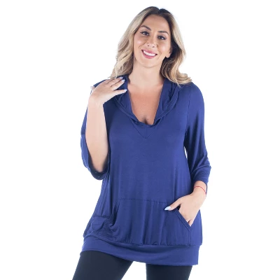 Relaxed and comfortable as can be, the 24seven Comfort Apparel Oversized Hoodie Top features ¾ length loose sleeves, front pocket, v-neck, and a trendy look. This women’s fashion plus size hoodie is perfect for a relaxed day.