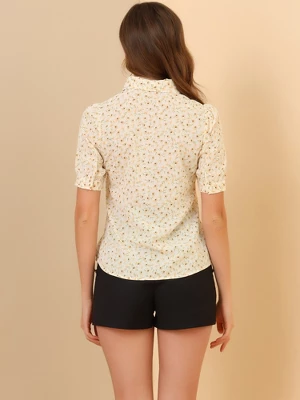 The lovely floral print makes a vintage statement on a short puff sleeve blouse in a regular silhouette. In a beige-based floral print, this blouse from Allegra K boasts puff sleeves and premium chiffon. Gently shaped with pintuck detailing along the round, split neckline, wear it to the office with tailored trousers and block heels for a sophisticated look. Retro and trendy, the blouse presents a feminine and demure aesthetic with its vinrage floral print.