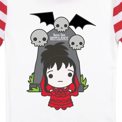 - CUSTOM DESIGN: Lydia Deetz sits in front of a gravestone with a winged skull on the graphic tee in this sleep set. Beetlejuice fans will love to celebrate the strange and unusual with this fun custom design.