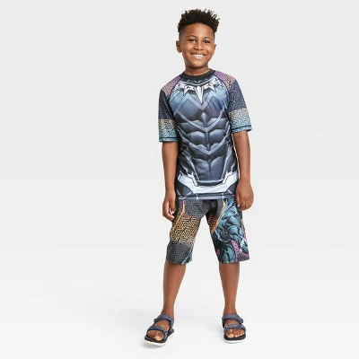 Add some Wakandan flair to your kid’s beach-ready looks with these Marvel Black Panther Swimsuit Trunks. Made from a soft fabric with full lining, these black swim shorts have a gigantic illustration of T’Challa, a “Black Panther” text logo and seamless geometrical print in purple, gray and yellow hues for an eye-catching, fan-favorite look. The sun-smart UPF 50+ rating helps keep your kid shielded from the sun’s UV rays, while the elasticized waistband with a flexible inner drawstring provides a snug, secure fit.