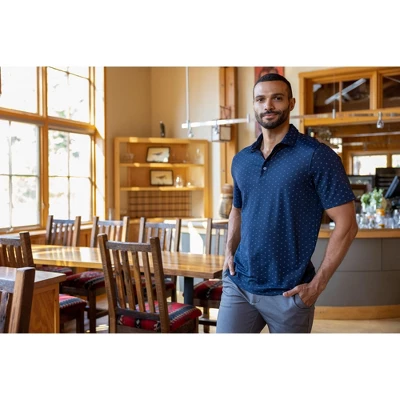 The iconic Virtue Eco Pique Tile Print Polo is engineered for exceptional versatility, designed as your favorite sustainable mens print polo shirt for golf, the office, WFH, travel, recharging, and for a night out. Ultra-lightweight, high quality, certified eco-friendly recycled drytec polyester is blended with elastane for stretch, a cooling effect, and UPF sun protection, resulting in the most versatile, sustainable, and comfortable print polo for you and the planet.