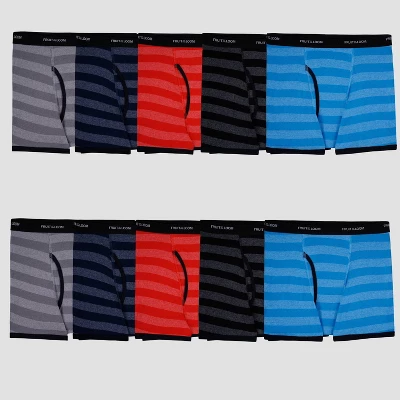 Fruit of the Loom Boys Striped Boxer Briefs were designed with the most comfortable fit in mind. These boxer briefs are made with leg bands that keep the legs in place for even the most active boy. Not only is the fabric soft, but the plush-backed waistband and tag free design add an extra touch of comfort that will make these boxer briefs your son’s favorite pair of underwear. These boxer briefs are made of lightweight and breathable cotton that will keep him cool throughout the day. Get more for your money with the Mega Value 10 Pack!