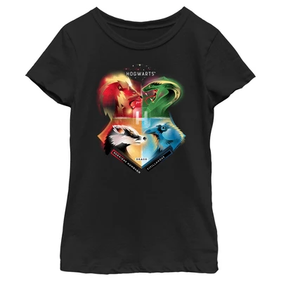 - Strut your stuff with this stylish new everyday Girls’ T-Shirt that is perfect for every occasion! Featuring the Hogwarts logo with its respective mascots from Gryffindor, Hufflepuff, Slytherin, and Ravenclaw!