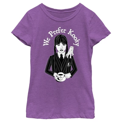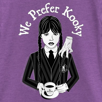 - Strut your stuff with this stylish new girls’ t-shirt that is perfect for every occasion! Featuring an illustration of Wednesday and Thing along with the phrase: “We Prefer Kooky” printed across the top.