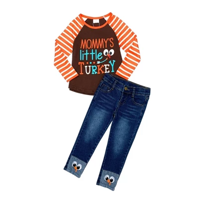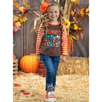 Mommy’s little turkey is growing up so fast! Give her lasting memories in this precious cuffed jeans set with an adorable raglan top.You’ve never seen a Turkey Day outfit this cute..