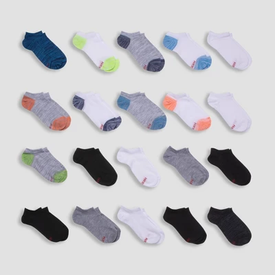 The Hanes Boys’ Super No Show Socks come in a super value pack of 20 pairs. This convenient large pack features a mix of colors and patterns. The Super No Show design hugs the heel and stays in place within his shoe. Made with spandex for a flexible, comfortable fit. Perfect for play all day.