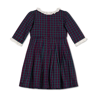 Talk about making an entrance this holiday! Cut from soft organic cotton in a timeless silhouette, this pretty dress will be your girl’s go-to piece for picture time. Features woven ruffle trim at the collar and cuffs, a gently ruffled waistline with velvet bow detail, and flattering 3/4 sleeves. Lined at the bodice with a zipper closure down the center back for easy dressing.