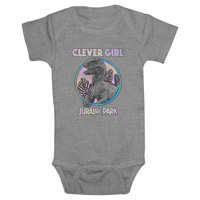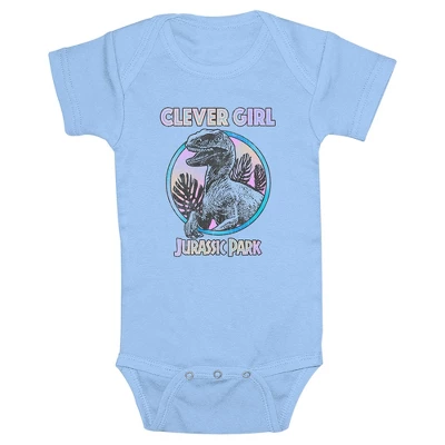 - The smallest family members are also the most stylish with this new onesie bodysuit that is perfect for crawling around and indoor play! Featuring a Velociraptor inside a circle logo with the words: “Clever Girl,” at the top in a distressed style.