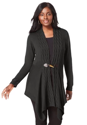 Warmth meets style in this asymmetrical-hem cardigan that will become your go-to. Pair it with jeans and a turtleneck for a cozy-chic look.