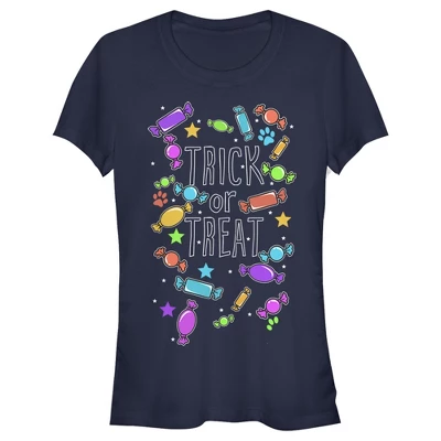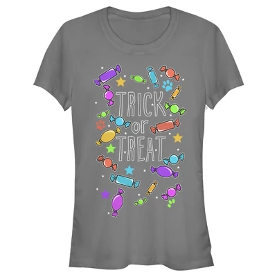 It’s our favorite time of year! Celebrate Halloween with this adorable Juniors’ Tee features the words “Trick or Treat” in bold across the front surrounded by colorful candies, stars, and paw prints.