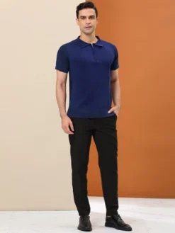 - Solid color, slim fit, ribbed h and shoulder cuffs, zip fly, stylish polo short sleeves shirt