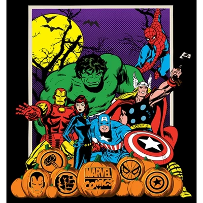 The Avengers always have the best costumes for Halloween so help them show off with the Marvel Halloween Avengers Scene Men’s T-Shirt! This cool Marvel Halloween shirt shows off a scene of Iron Man, the Hulk, Spider-Man, Captain America, and the Black Widow alongside pumpkins and a full moon!