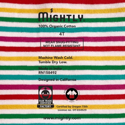 Mightly Shorties PJ Sets are cut with a slim and snug fit that meets CPSC safety requirements so that we do not have to use chemical flame retardants to make them fire-safe. Our dye process results in long-lasting color that won’t irritate sensitive skin. Mightly’s GOTS ID# is OT-034929. Mightly clothing is made in Fair Trade Certified factories. These factories must adhere to rigorous social, environmental and economic standards to protect the health and safety of workers. This means safe working conditions, no child or forced labor, elimination of harmful chemicals, guaranteed maternity leave, and much more. Mightly’s Fair Trade ID# is 1716500.