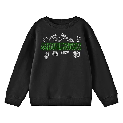 Ignite your passion for Minecraft with this youth black crew neck long sleeve sweatshirt. Featuring a playful doodle design of elements from the game behind vibrant green letters, this sweatshirt captures the essence of the Minecraft world. Made with sustainably and fairly grown USA cotton and polyester, it offers a comfortable and eco-friendly fabric that you can feel good about wearing. With its custom design, long sleeve style, and official Minecraft licensing, this sweatshirt is perfect for young gamers and Minecraft enthusiasts.