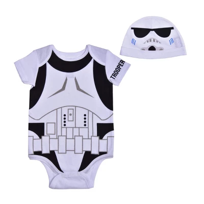 - COMPLETE BABY OUTFIT: Star Wars creeper comes with a matching cap that’s great as everyday wear, for costume parties and pictorials too! Inspired by Star Wars’ classic characters in detailed prints; choose between Darth Vader, R2D2, Chewbacca and Stormtrooper.