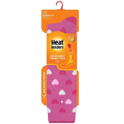 Compare with 8.6″ for Women’s Crew.Heat Holders® LITE™ thermal socks have been designed to provide our famous thermal protection and comfort in a medium thick profile, ideal for wearing in casual shoes and boots!Compared to our ORIGINAL™, maximum loop length thermal socks with 2.34 Tog rating (Thermal Overall Grade), Heat Holders® LITE™ thermal socks have a medium loop length with 1.60 Tog rating.Keep feet warm on the coldest of days and pull on this pair of hearts pattern, medium thickness, long length Heat Holders® LITE™ for women, the warmest thermal sock.Heat Holders® are made from a specially developed heavy bulk yarn which has extreme thermal qualities. With medium pile cushioning, these thermal socks will help keep feet fully comfortable and supported.The inside of each sock has been intensively brushed, such that they not only feel sensationally soft but also trap warm air close to the skin keeping your feet warmer for longer.Heat Holders® are non-binding; they are also diabetic friendly and provide relief for cold feet due to circulation problems.
