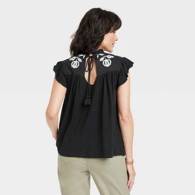 Dress up your warm-weather look with this Flutter Short-Sleeve Embroidered Top from Knox Rose™. This flutter short-sleeve top adorned with cream floral embroidery on the front and back yoke brings extra charm to your closet. Fashioned in a loose fit, it features pretty lettuce frills along the neck and a back keyhole vent with a tie detail for added flair. Plus, the lightweight cotton fabric offers cool and comfortable all-day wear.