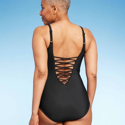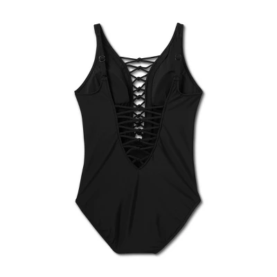 This Aqua Green one piece offers the perfect balance between simple and alluring, with a dramatic front and back plunge. Adorned with intricate knot and strappy detailing, this swimsuit can be paired with a flowy cover up or shorts for the perfect vacation look. In classic black, this is truly a stand-out and versatile piece.